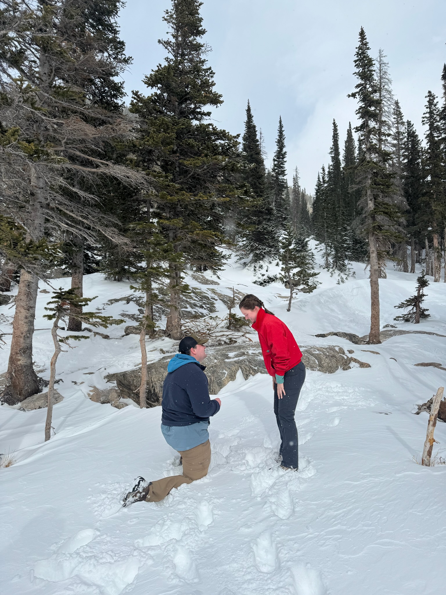 In December of 2023, Anna and Josh had some friends visiting from out of state. As good hosts do, Josh and Anna planned lots of fun Colorado things to do while they were there. One of them being a winter hike in Rocky Mountain National Park. On the way up to the National Park the roads were icy and Anna suggested turning around multiple times. Josh just kept saying “I think it will be okay, lets see if the road gets worse”. They ended up doing a 2 mile hike up to Dream Lake Trail. The trail was empty and at the very top Josh proposed! It was perfect.